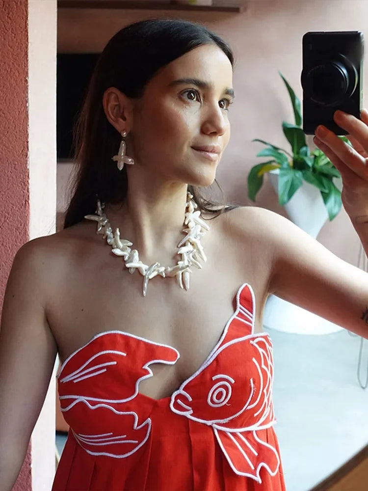 Com um design ousado, apresenta um bordado de peixe detalhado no busto, que chama imediatamente a atenção e cria um ponto focal intrigante.